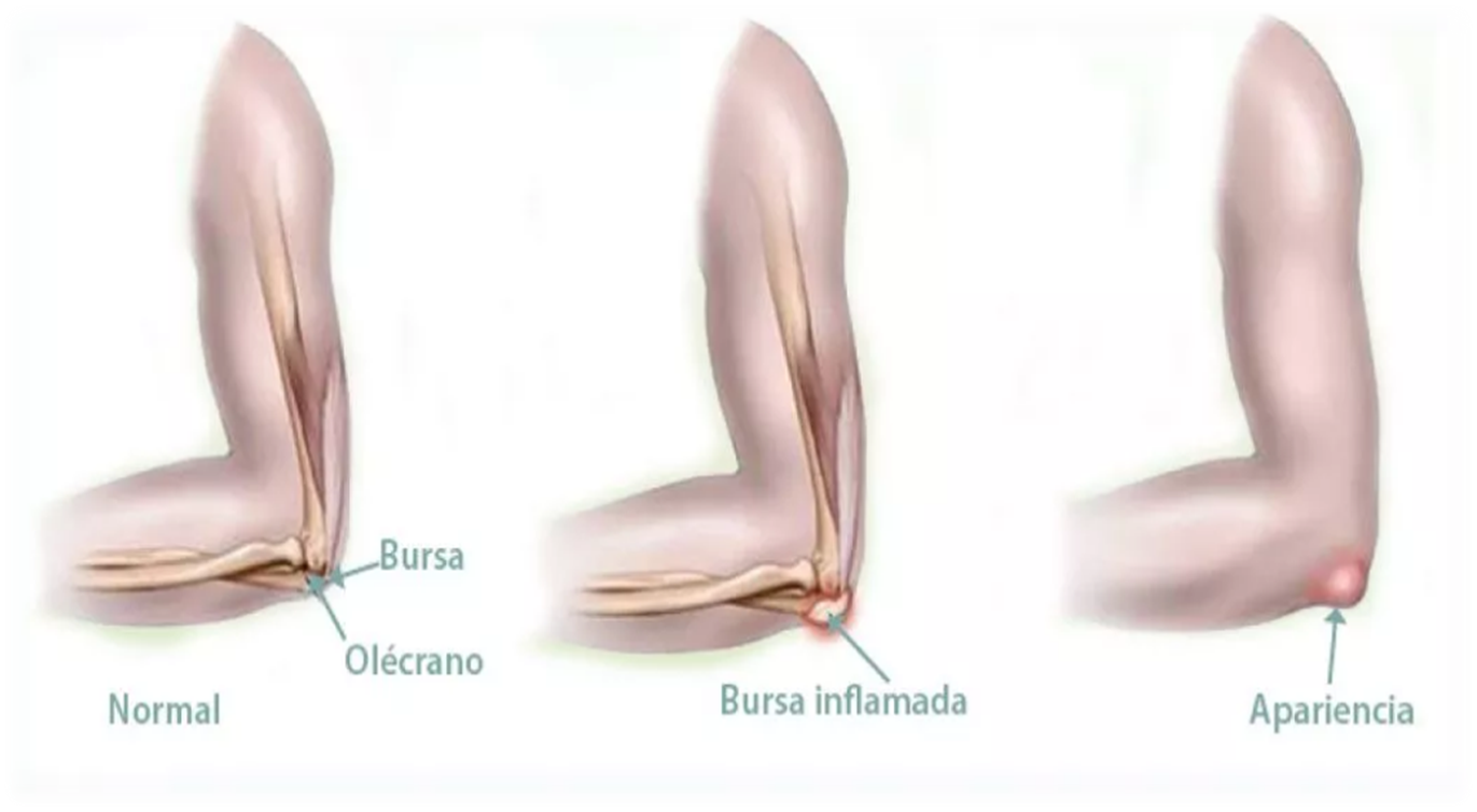 La bursitis olecraniana es la inflamación de la bursa que se encuentra en el olecranon (región posterior del codo) en donde se inserta el tendón del tríceps, produciendo dolor y limitando el movimiento.